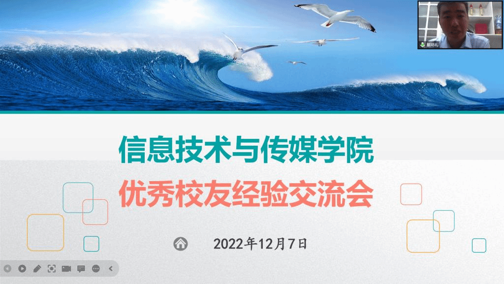 交流会上,戴明礼如数家珍般回顾了自己在母校学习和生活的难忘瞬间,深情追忆了在校期间与老师、同学们建立的深厚情谊,深切表达了对母校多年栽培的感谢和对母校未来发展的深深祝福,并结合自己的亲身经历,就疫情当前如何坚持专业学习、如何自我分析及如何培养时代思维等和与会师生进行了互动和交流,给予在场学弟、学妹们许多实用性建议和忠告。