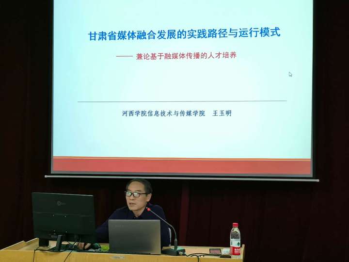 王玉明教授先介绍了国家实施媒体融合发展的时代背景与战略部署,甘肃省县级融媒体和市级融媒体发展推进过程,取得的成绩;接着介绍了融媒体中心建设的标准,指出了县级融媒体中心建设的总体目标和建设要求,以及县级融媒体中心的主要职能和业务范围,以及融媒体中心业务运行——“中央厨房”模式。最后,王玉明教授就基于融媒体发展的人才培养,怎样培养合格的融媒体专业人才给出了建议和意见。