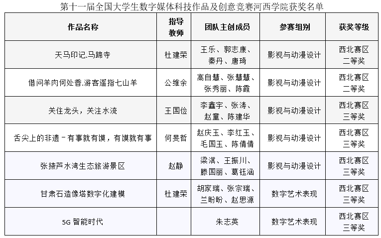 竞赛吸引了来自全国各地的优秀学子积极参与。为积极备战比赛,公司提前组队,搭建线上线下多种指导方式,指导员工开展能力训练,给予员工全面有效的帮助。最后,由王乐、高自慧、胡家瑞等多名同学创作,杜建荣、公维余等老师指导主创的《天马印记﹒马蹄寺》等7部作品分获西北赛区二、三等奖。