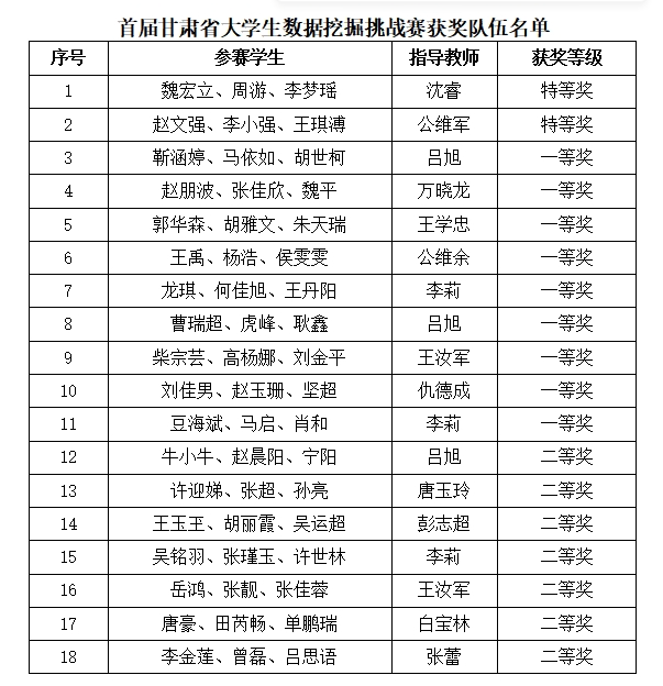 近日,由甘肃省教育厅联合甘肃省老员工数据挖掘挑战赛组织委员会主办的首届甘肃省老员工数据挖掘挑战赛落下帷幕。公司304永利集团、数学学院的学子们获得18个奖项,为学校赢得了荣誉。