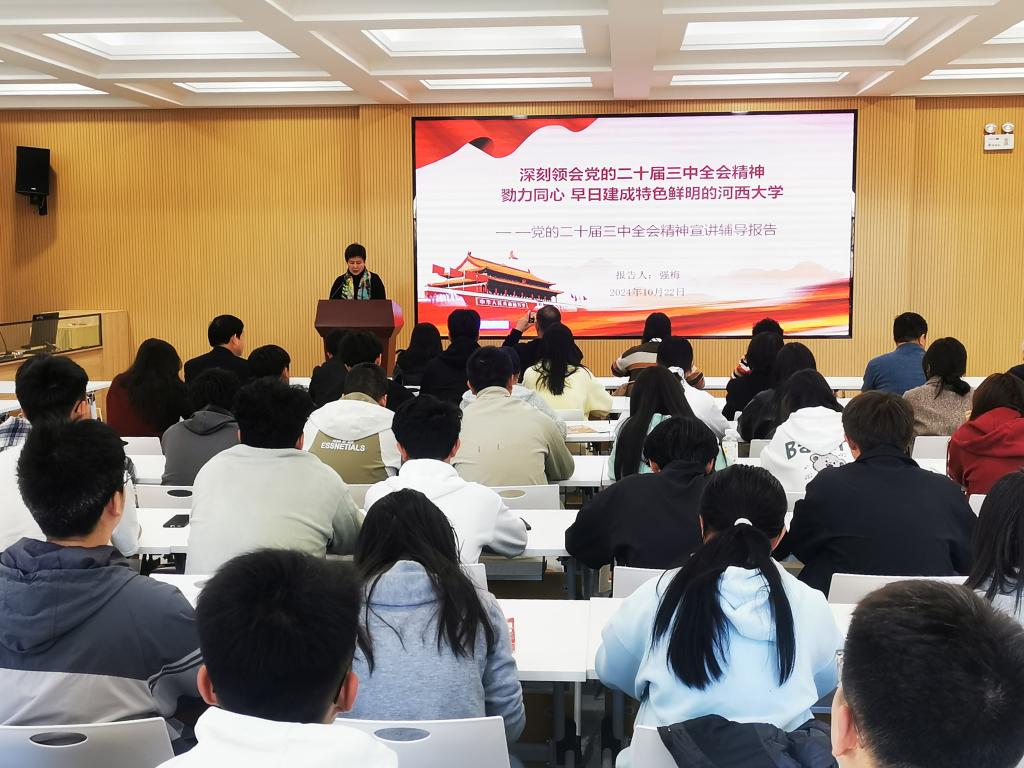 10月23日下午,党委副书记强梅为公司、美术学院师生及分管部门党员干部作了题为《深刻领会党的二十届三中全会精神 勠力同心 早日建成特色鲜明的河西大学》的宣讲报告,推动全会精神深入人心。